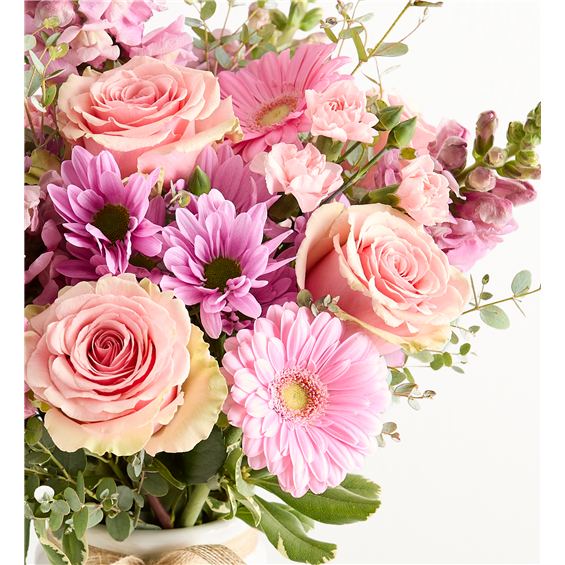 EXCLUSIVE Get them buzzing! A glorious mix of blooms in shades of pink and lavender, our eye-catching bouquet dazzles with color and texture. Designed in our Sweet As Can Bee artisanal vase, featuring an adorable honeybee, and accented with a raffia bow, it’s a gift that adds charm and beauty to any decor.